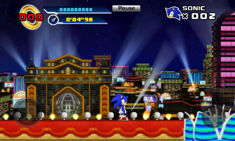 Il faut le dire d'emblée, le joystick virtuel n'est pas très précis si vous avez de gros doigts ou si vous jouez sur un petit écran. C'est un contrôleur autorisant plus de 4 directions alors suivant comment vous positionnez votre pouce et bien Sonic regardera en haut au lieu d'avancer vers la droite, c'est un coup de main à prendre mais même après quelques heures de jeu on est toujours un peu hésitant et se manque de précision devient frustrant quand il faut être justement précis. Sur tablette c'est beaucoup plus jouable car le joystick est plus gros et là le jeu devient tout de suite beaucoup plus agréable à jouer. Côté performances je note des lags par moment sur mon Nexus S avec des gros ralentissements par moment (quand Sonic va vite) mais ce n'est pas tout le temps et le jeu est donc parfaitement jouable dans de bonnes conditions. Sur ma tablette qui est moins puissante pourtant mais qui ne dispose que d'Android 2.3.1 le jeu est un tout petit peu moins fluide mais je n'ai aucune chutte de framerate et aucun gros lags, comme je vous l'ai déjà dit l'expérience sur tablette est vraiment plus agréable.